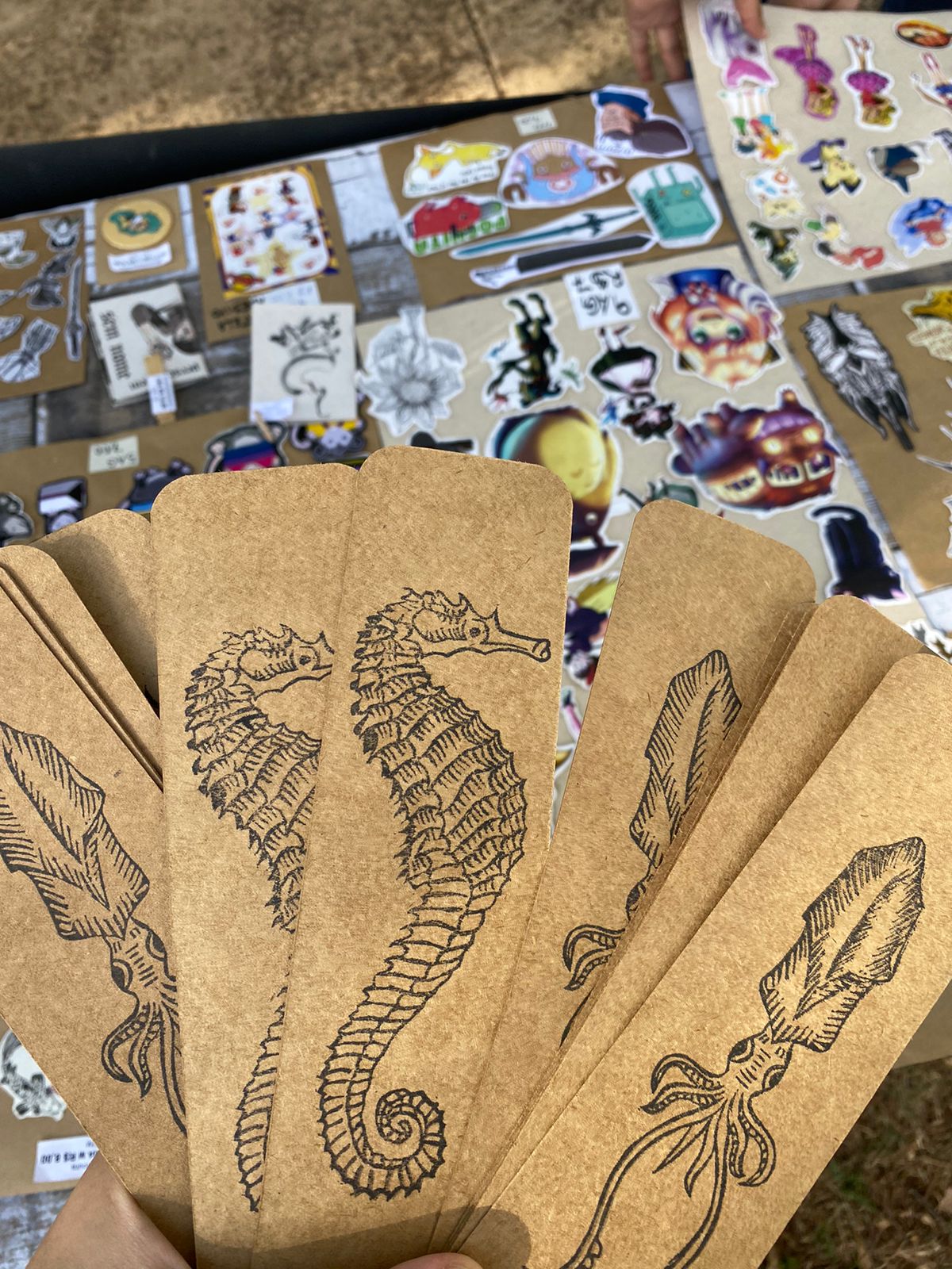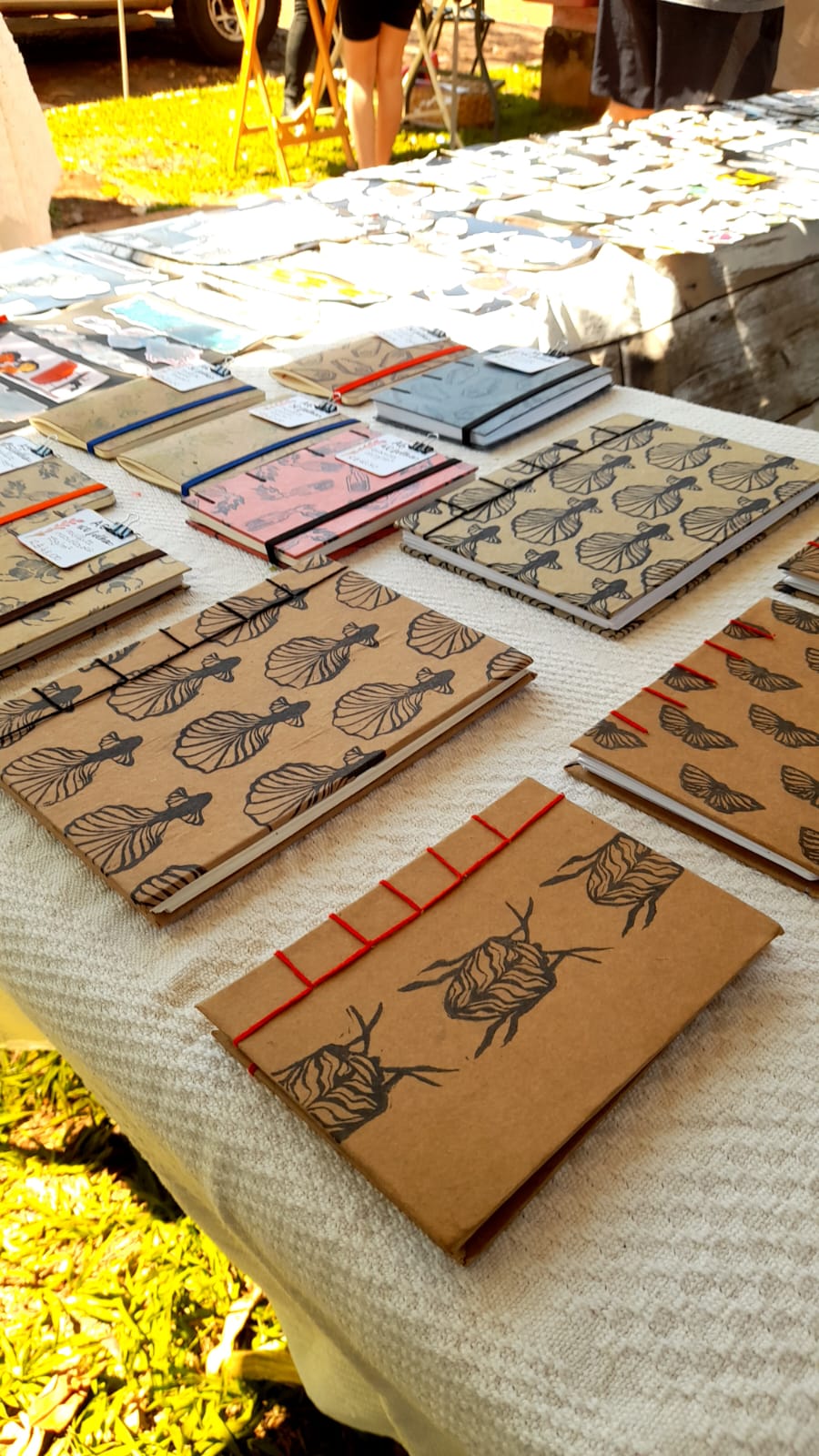 Thais Soares, membro do coletivo, destaca que todos os cadernos feitos pela artista são feitos à mão, utilizando papel pólen de noventa gramas. As estampas são autorais, criadas com desenhos e carimbos feitos à mão. São utilizadas diferentes técnicas de costura, aprendidas através de cursos, tutoriais online e experimentação.