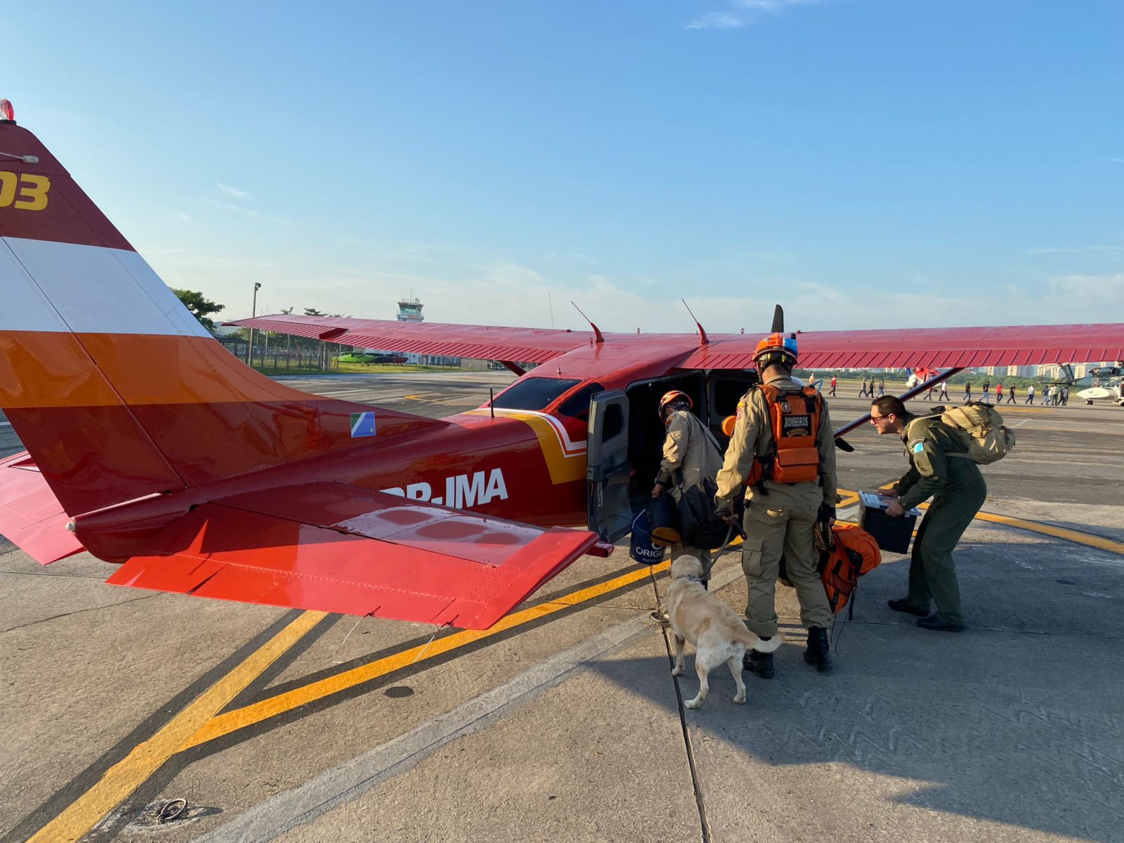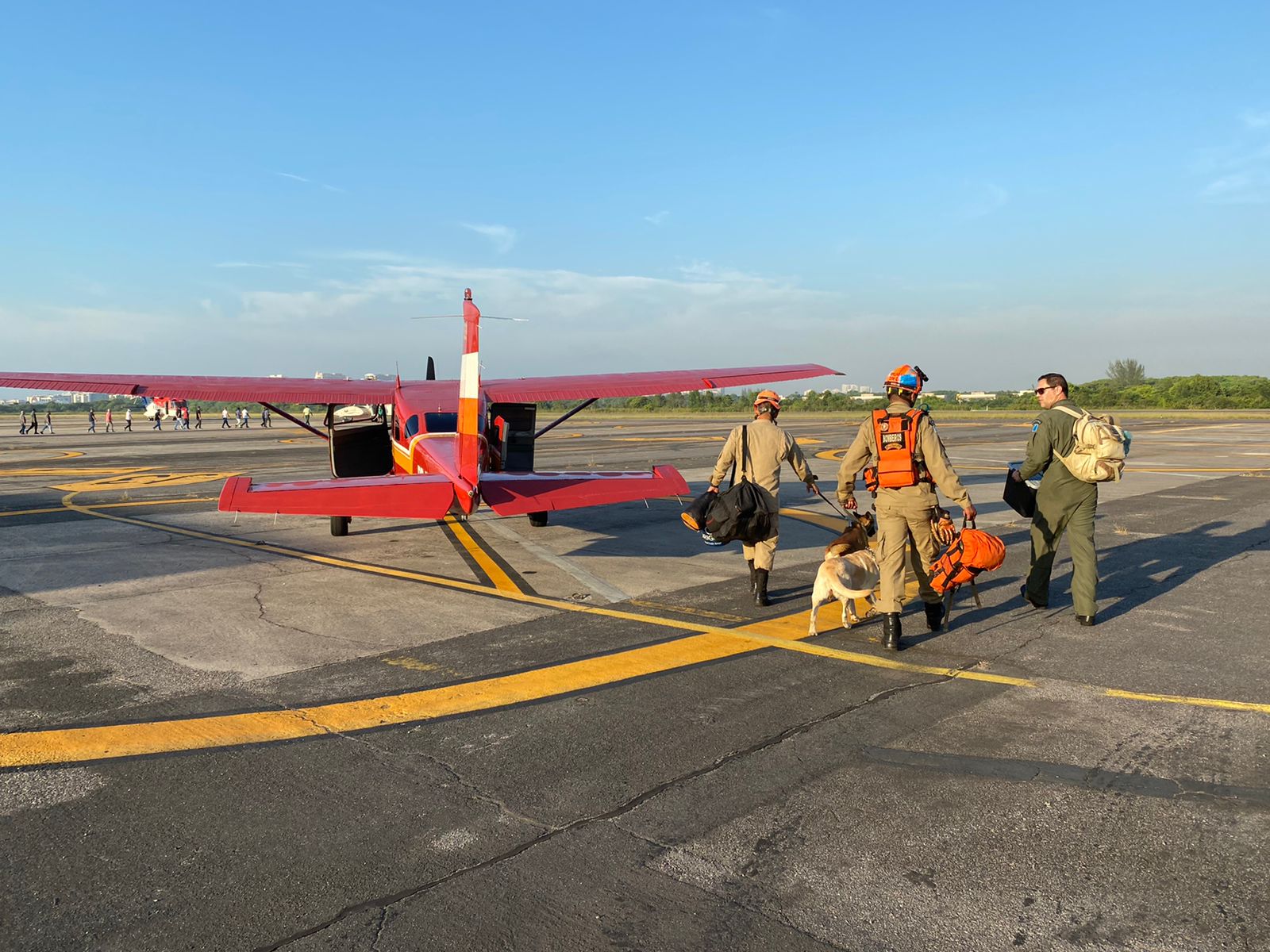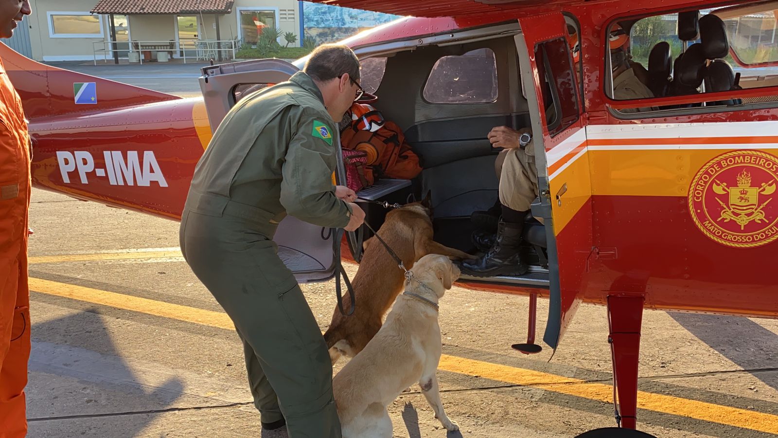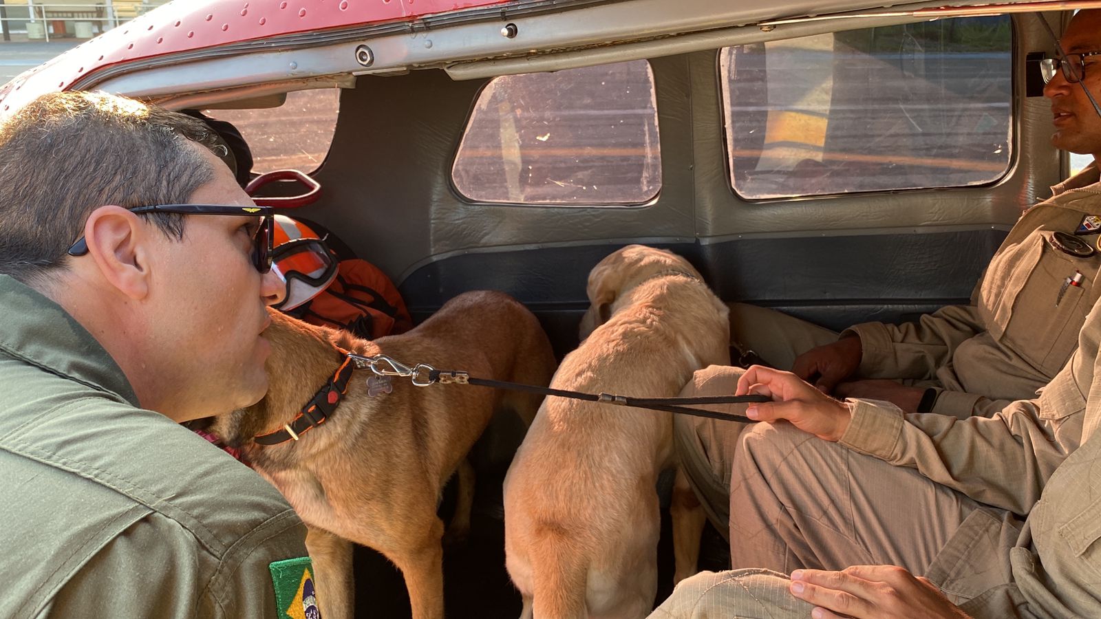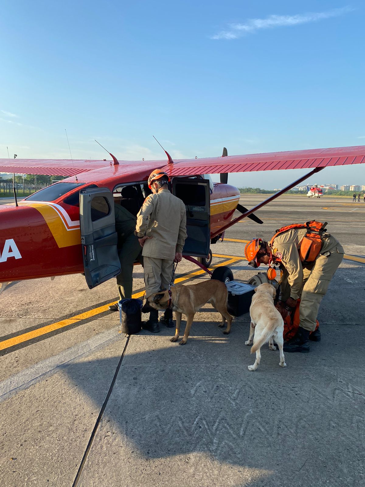 As cadelas Cindy e Mali, com seus respectivos condutores chegam ao aeroporto Santa Maria, por volta das 12h30 deste sábado.