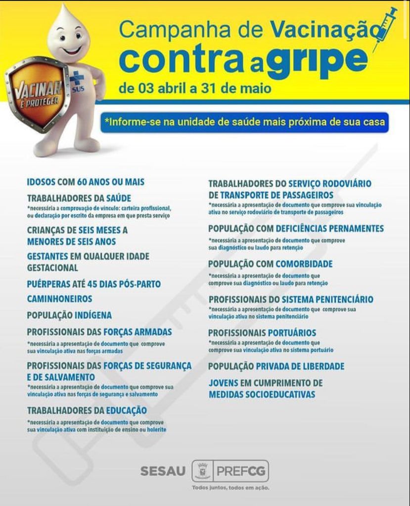 A campanha de vacinação contra a gripe foi iniciada há 11 dias na Capital e até o momento 25.800 pessoas foram vacinadas. A meta é imunizar 90% dos públicos estabelecidos como prioritários, pelo Ministério da Saúde, o que corresponde a 200 mil pessoas.