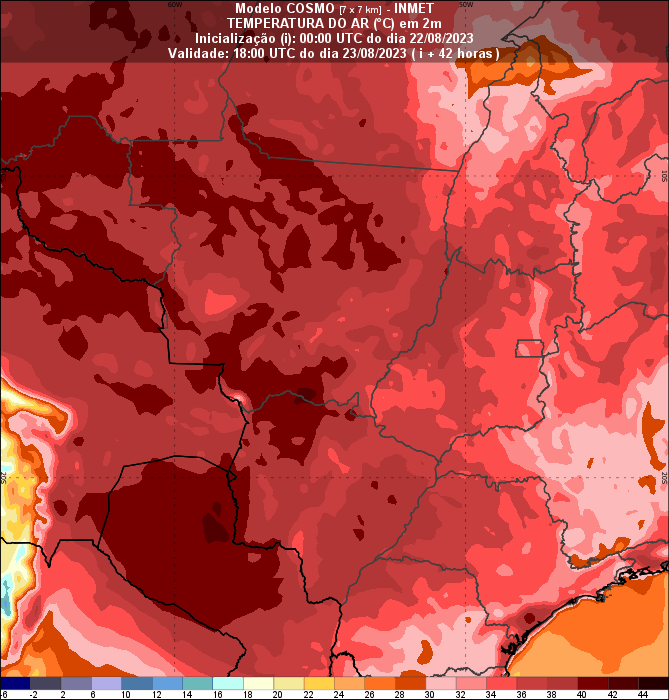 Entretanto, no fim de semana, devido à aproximação de uma nova frente fria, haverá queda acentuada nas temperaturas, com possibilidade de chuva em MS, principalmente nas regiões centro-leste.