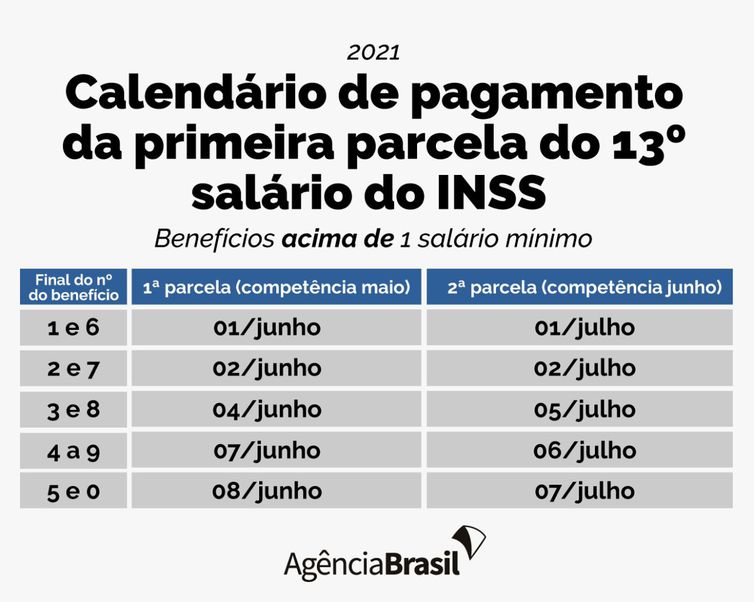 Antecipada para maio por causa da pandemia de covid-19, a primeira parcela do décimo terceiro do Instituto Nacional de Seguro Social (INSS) começará a ser paga no próximo dia 25 e segue até 8 de junho. A segunda parcela será paga entre 24 de junho e 5 de julho.