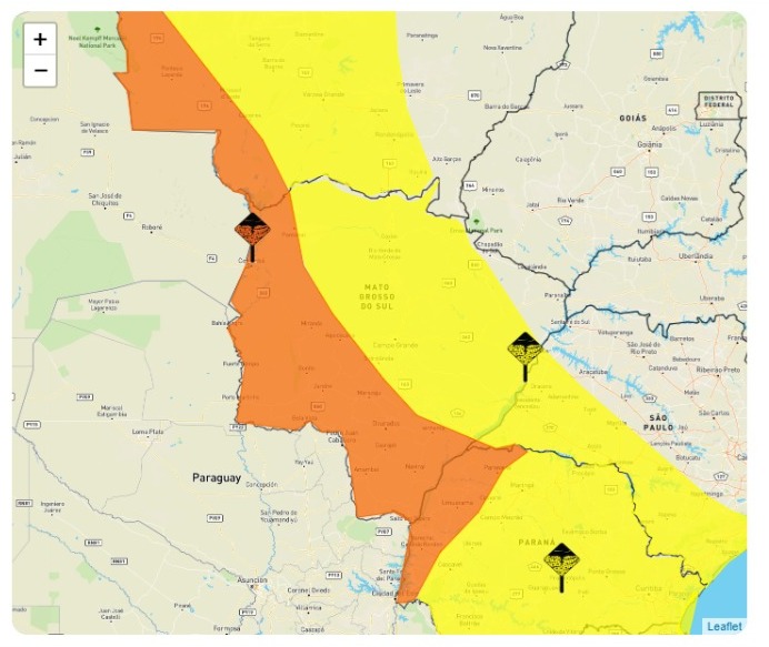 O Inmet (Instituto Nacional de Meteorologia) divulgou dois alerta para Mato Grosso do Sul. O alerta laranja, ou seja, de perigo, indica chuva entre 30 e 60 mm/h ou 50 e 100 mm/dia, ventos intensos (60-100 km/h), e queda de granizo. Risco de corte de energia elétrica, estragos em plantações, queda de árvores e de alagamentos. Já o alerta amarelo, de perigo potencial, indica chuva entre 20 e 30 mm/h ou até 50 mm/dia, ventos intensos (40-60 km/h), e queda de granizo. Ambos os alerta valem para a maioria do estado até as 10 horas de sábado (15).