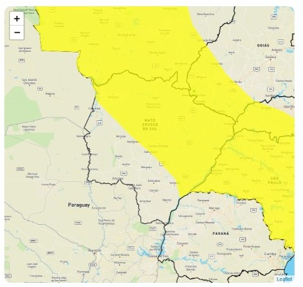 Já o alerta amarelo, indica perigo potencial para chuvas intensas entre 20 e 30 mm/h ou até 50 mm/dia, ventos intensos (40-60 km/h). Baixo risco de corte de energia elétrica, queda de galhos de árvores, alagamentos e de descargas elétricas. Este alerta vale para 43 municípios de Mato Grosso do Sul, incluindo Campo Grande. O alerta laranja vale para 47 cidades, principalmente das regiões sul e oestre.