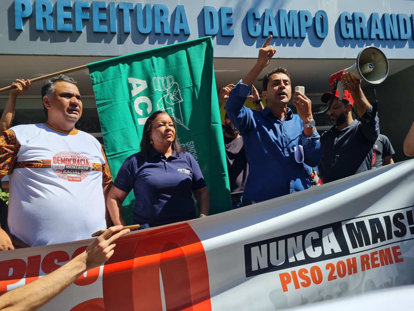 Os professores da Reme (Rede Municipal de Ensino) realizam paralisação na frente da Prefeitura de Campo Grande na manhã desta sexta-feira (25) e exigem o cumprimento da Lei Municipal nº 6.796/2022 que prevê reajuste salarial escalonado. Nesta semana a prefeitura encaminhou um Oficio para a ACPMS (Sindicato Campo-grandense dos Profissionais da Educação Pública) sem a correção de 10,39% referente ao mês de novembro e previsto em lei.