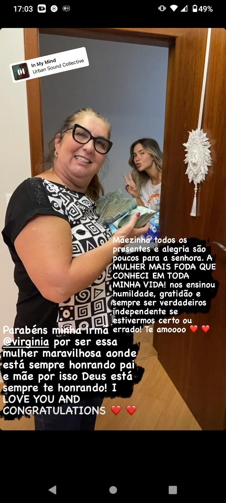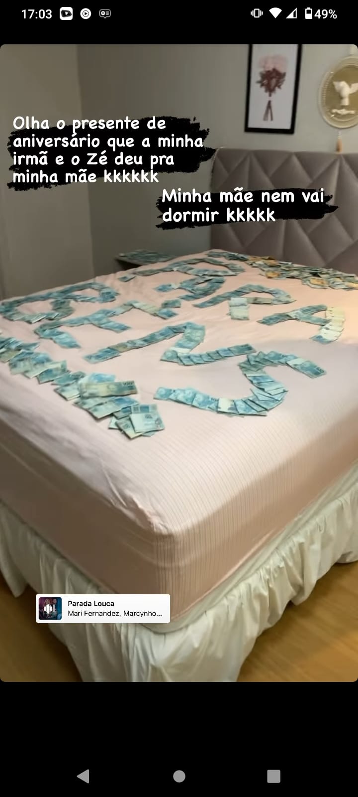 A influenciadora Virginia e o marido, o sertanejo Zé Felipe, deram o dinheiro em notas de 100 e 200. O casal deixou as notas espalhadas pela cama, formando a palavra “parabéns”. Ao entrar no quarto, a mãe de Virginia se surpreendeu com o presentão e disse: “Que isso? Meu Deus, que decoração é essa? Estou toda arrepiada. Estou rica”.