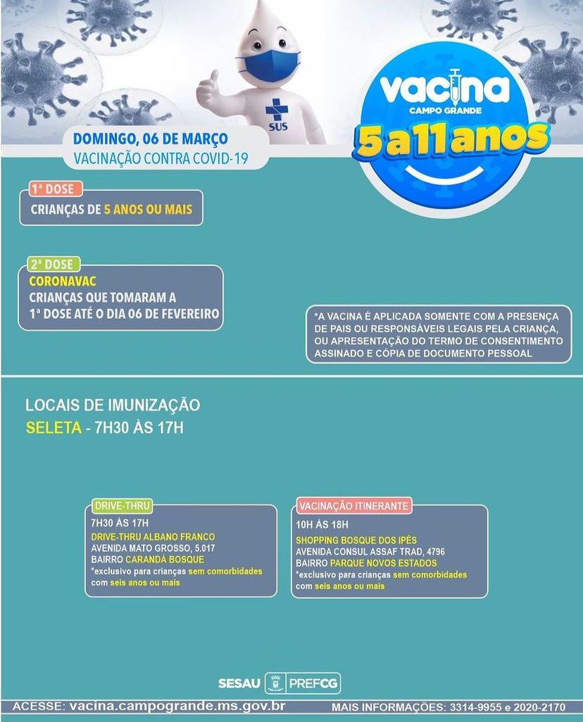Com as vacinas disponíveis da primeira a quarta dose, a imunização começa em crianças a partir dos cinco anos.
