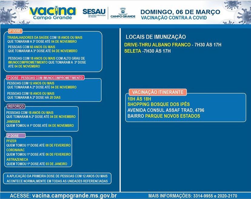 A Sesau (Secretaria Municipal de Saúde Pública) divulgou hoje (6) o calendário de vacinação com os pontos de imunização contra a COVID-19 na Capital.
