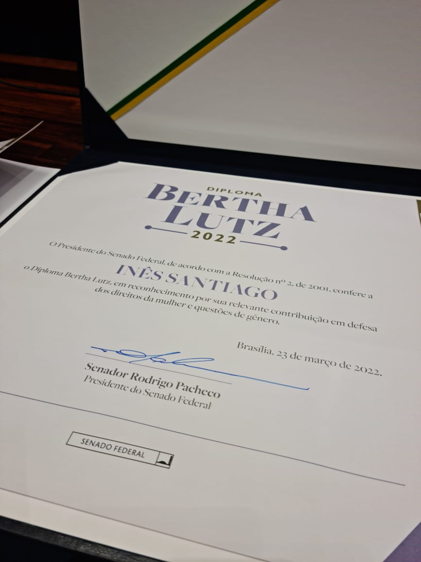 No plenário do Senado Federal, a presidente da FCDL-MS (Federação da Câmara de Dirigentes Lojistas de Mato Grosso do Sul), Inês Conceição Santiago Silva, recebeu hoje (23) o Prêmio Bertha Lutz, que reconhece a contribuição da representante da categoria no Estado em defesa dos direitos da mulher e as questões de gênero no Brasil.
