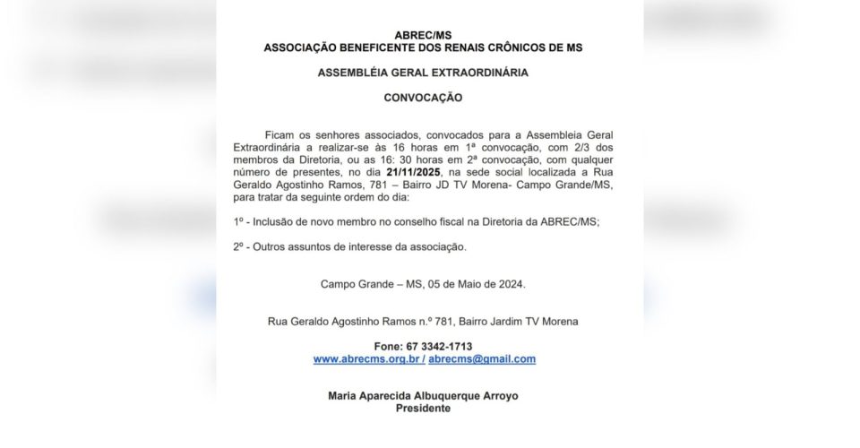 A ABREC-MS (Associação Beneficente dos Renais Crônicos de Mato Grosso do Sul) convoca todos os associados para participarem da Assembleia Geral Extraordinária, que será realizada no dia 21 de novembro de 2025, na sede social da entidade, localizada na Rua Geraldo Agostinho Ramos, nº 781, Bairro Jardim TV Morena, em Campo Grande.